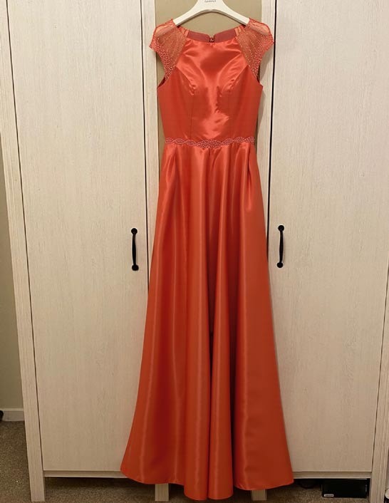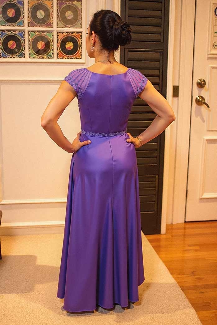 Wear this exceptional dress to dazzle the crowd. From top to bottom, this lovely gown is made of satin fabric. It has a bodice with a scoop neckline, short sleeves, and sequin detailing. There is a center zipper closure design on the back. Your curves will be highlighted by the a-line silhouette as it flares out to a full hem. Dress up this stunning design by this dress to achieve a classic and refined look.