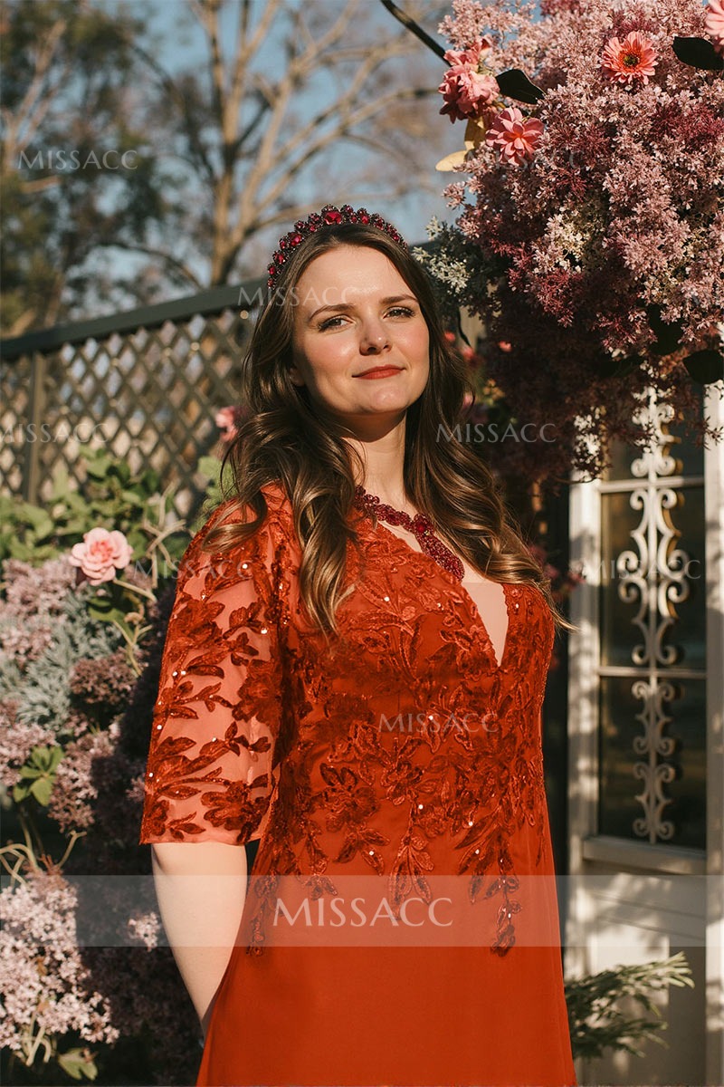 Discover our A-line V-neck chiffon mother of the bride dress, featuring lace detailing for a sophisticated and elegant wedding day look. Perfect for a floor-length style that flatters any figure.