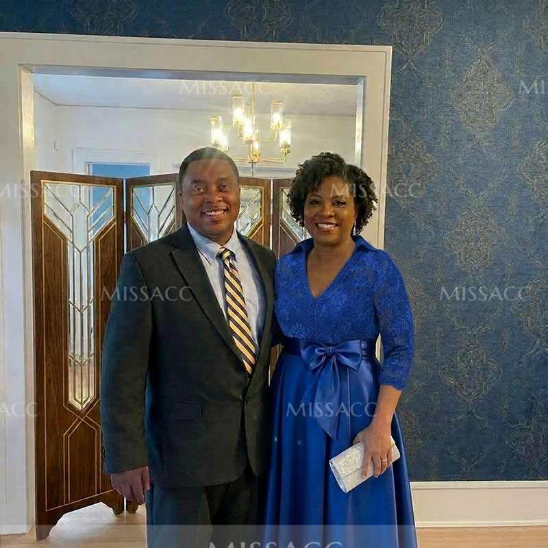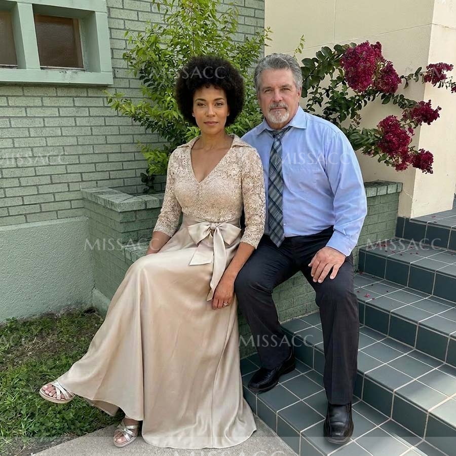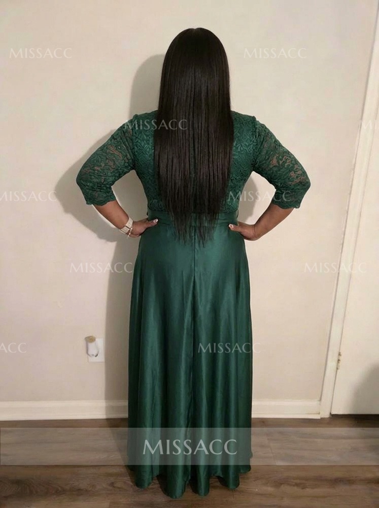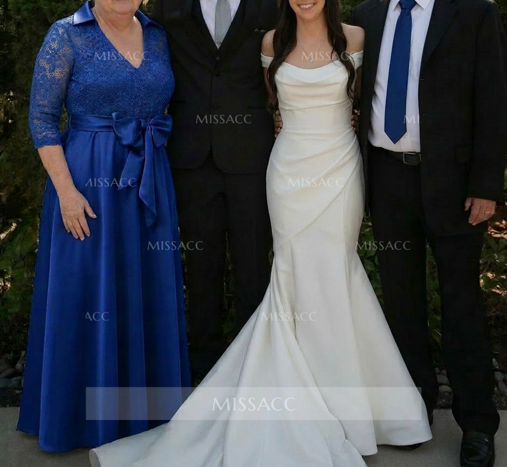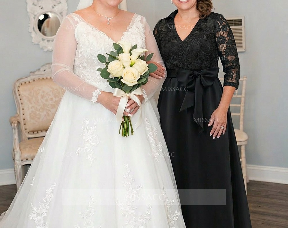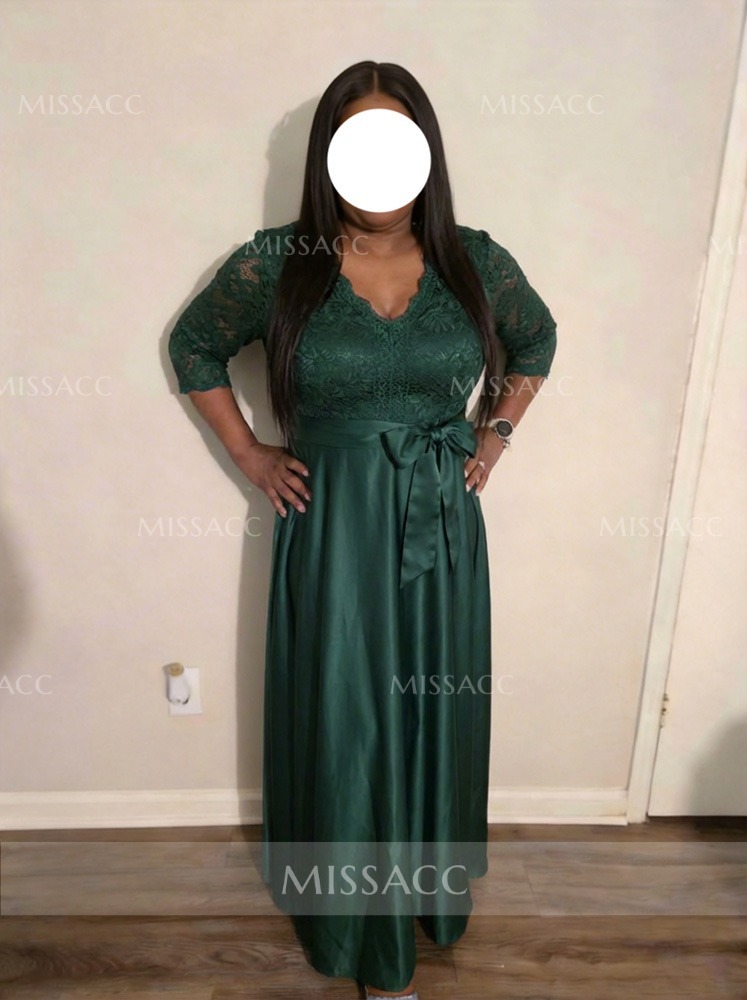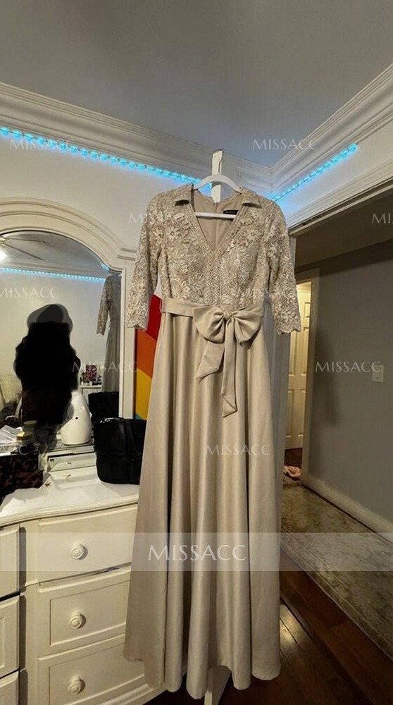 **Graceful Satin Mother of the Bride Dress with Bow & Lace ** This floor-length A-line satin gown features a flattering V-neckline and exquisite lace detailing with a charming bow accent. Perfect for weddings and formal events. Shop mother of the bride dresses and occasion wear for unforgettable style.