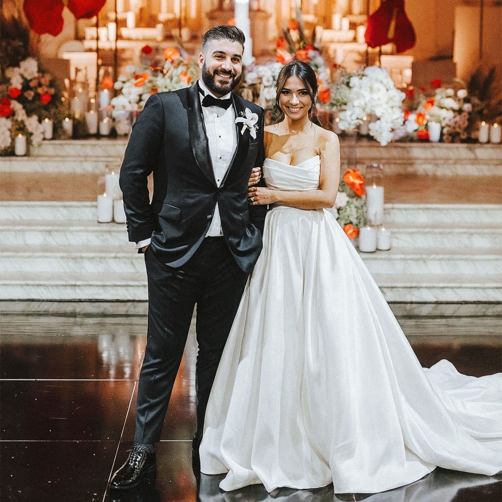 Discover our ball gown wedding dress in satin, featuring a V-neck design. Timeless elegance for your special day. Perfect for a romantic wedding ceremony.