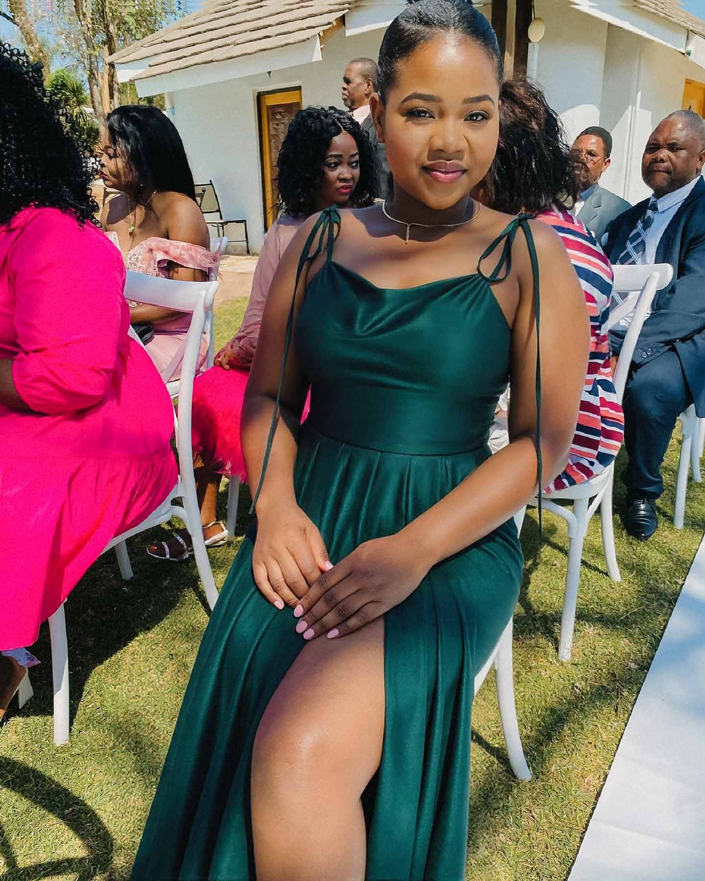 Honestly, I was a little worried about how the satin would look in person, but it's really lovely quality. It has a subtle sheen that catches the light beautifully. The slit is positioned nicely and adds a touch of modern elegance. This dress is perfect for any semi-formal occasion.