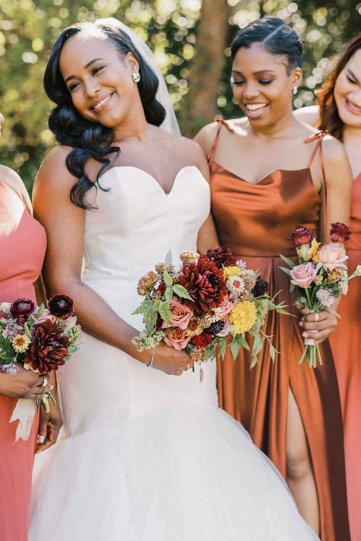 Discover our Rust Satin A-Line bridesmaid dress with spaghetti straps, featuring a chic slit. Perfect for weddings and formal events, this elegant gown offers a timeless look.