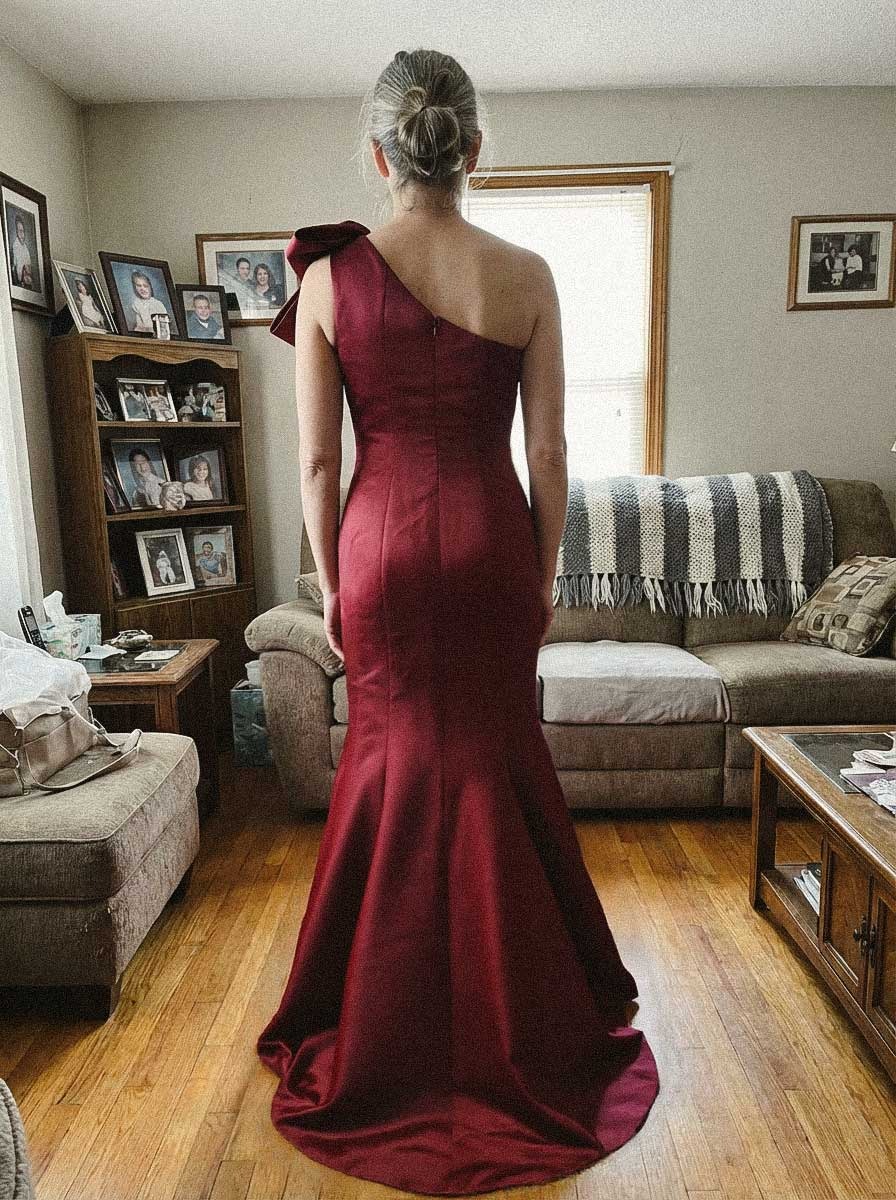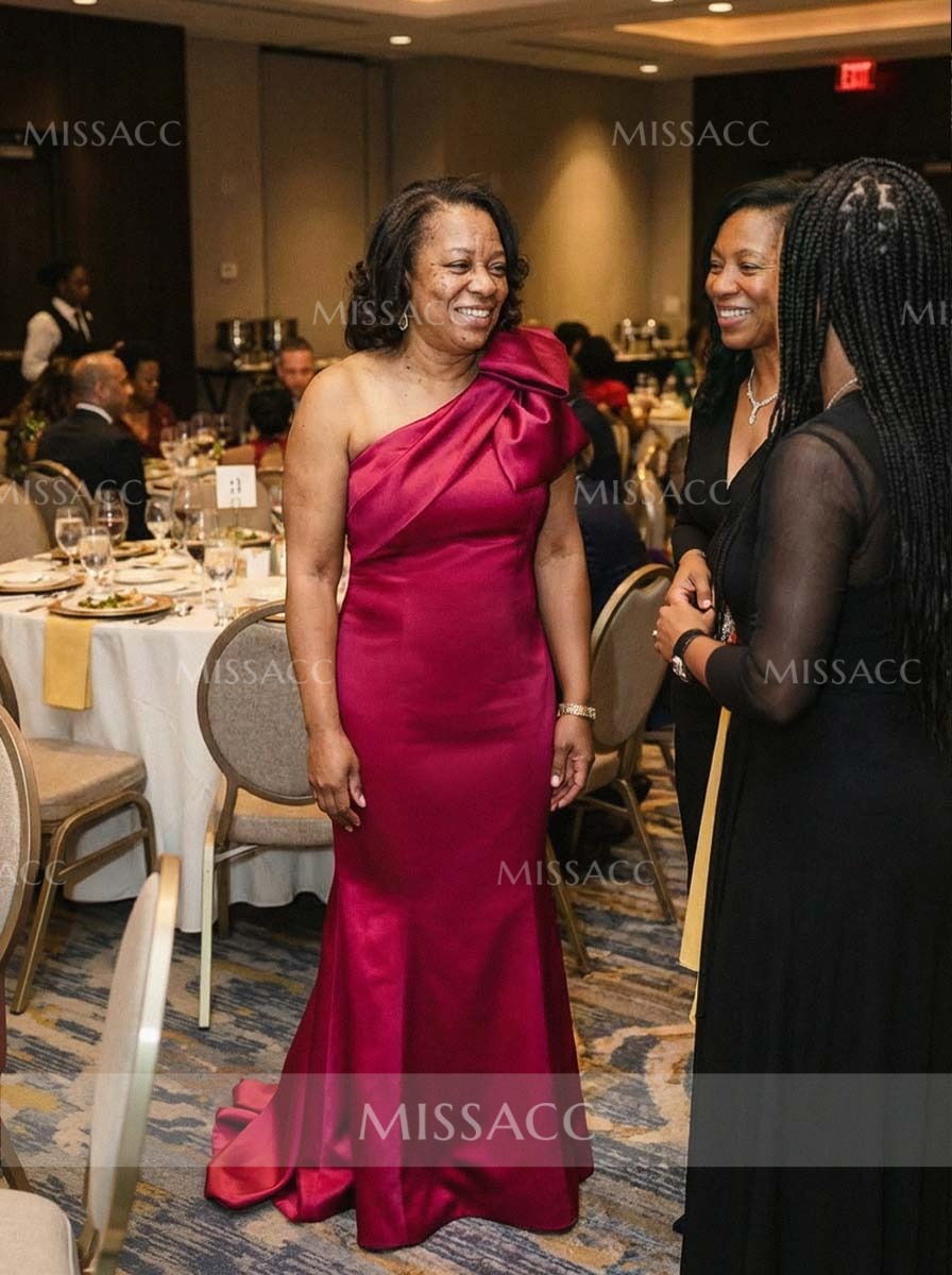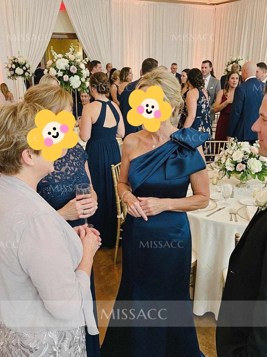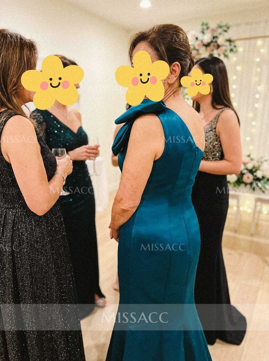 Show off your bubbly and pleasant personality with this long fabulous dress. This mother of the bride dress has fashionable one shoulder neckline, bow embellishment, and a fitted bodice. A fit and flare mermaid train would captivate everyone in the room. This dress is tailored to fit your curves.