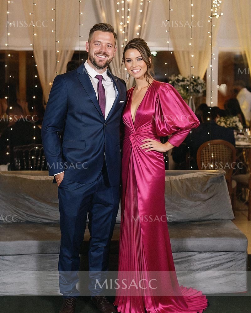 Stunning mermaid silhouette evening dress in luxurious silk-like satin, featuring a flattering V-neck and long sleeves for a sophisticated look perfect for special occasions.