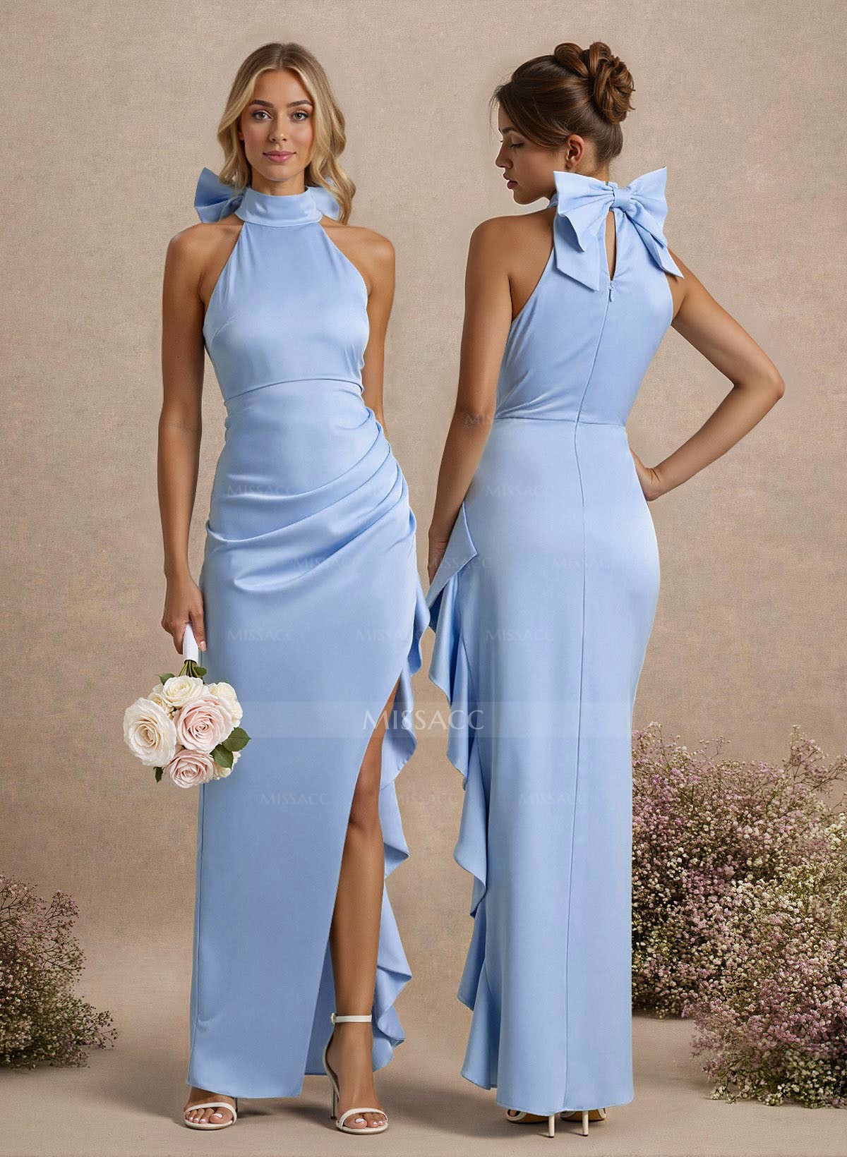 Unique Bow(s) High Neck Ruffle High Split Floor-Length Satin Bridesmaid Dresses